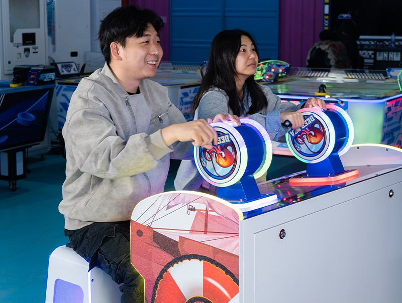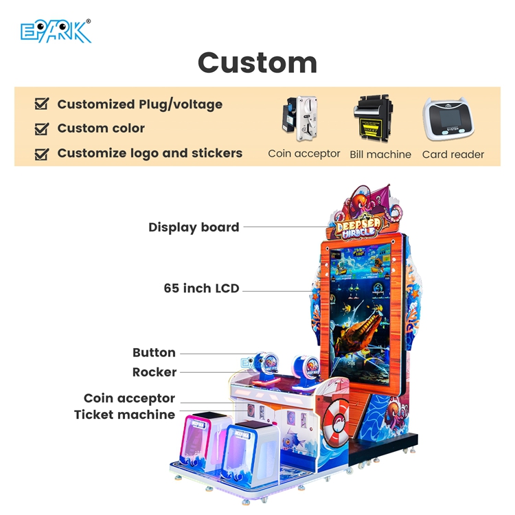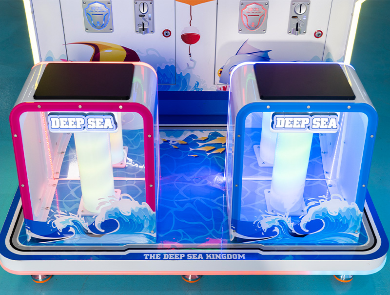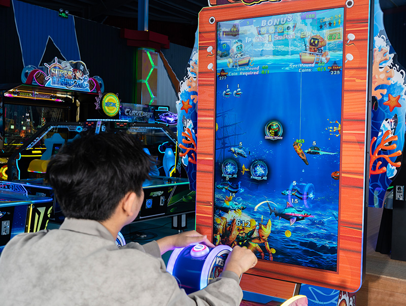 | Insert coin to start the game. | Each player controls their fishing rod using the button or joystick. | Aim at the moving fish and press the button to catch them. | The game ends when time is up, and the player with the higher score wins. |
