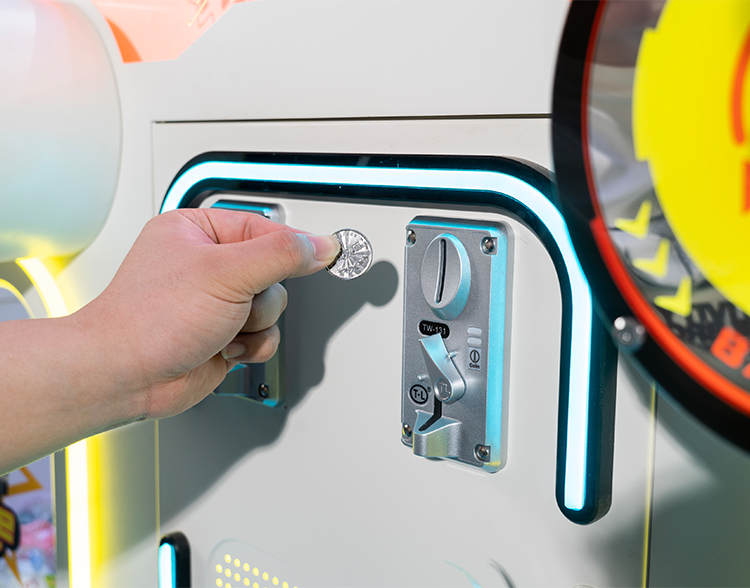 1. Insert coins to activate the machine's dazzling lights and exciting sounds. The challenge is about to begin!