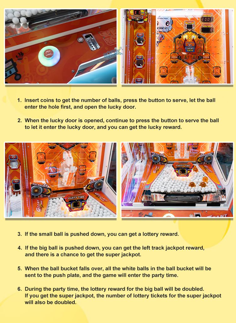 1. Insert coins to get the number of balls, press the button to serve, let the ball enter the hole first, and open the lucky door.