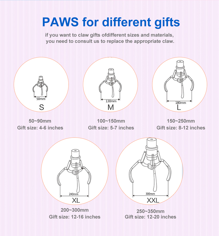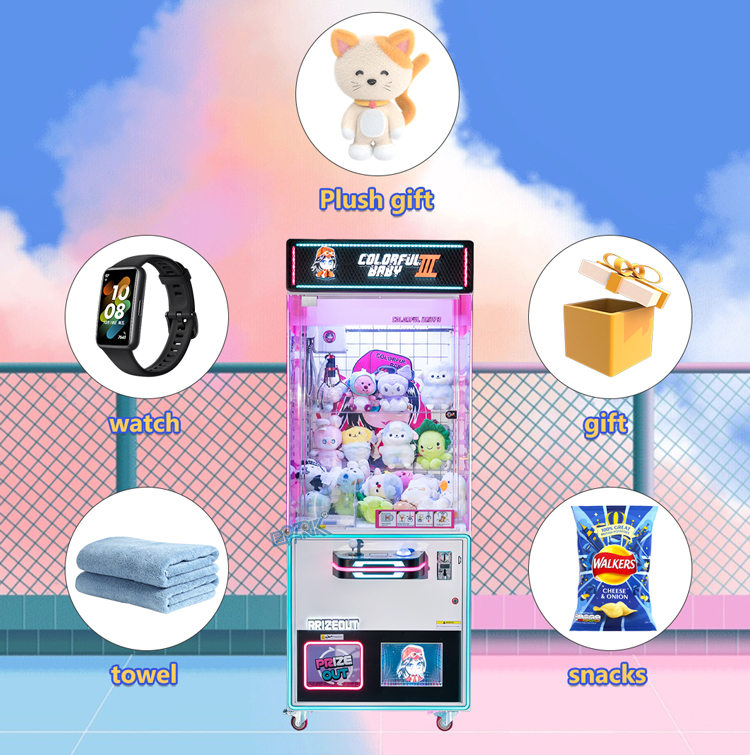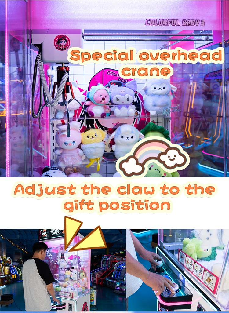 Claw crane machine is a nice combination of buying and leisure. 1. This crane game is very popular with people of all ages, and comes with prize redemption features,if you pass the game! 2. Players explore the sweet, wonderful and colorful world of game style video touch screen game.Player will through different game levels in this fun game to get prize or plush. 3. Player could aim at the doll from the overhead. 4. The player can free combines the colors, which makes your shop more gorgeous and attractive. 5. Fashionable transparent machine attracts player for the first sight. 6. Abundant and flexible background settings, ensures your revenue. 7. Aiming at the dolls from multi-angles, makes your catch at your own will and helps you enjoy the achievement once catches.