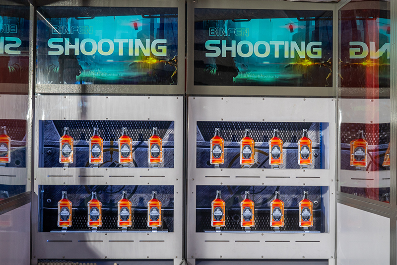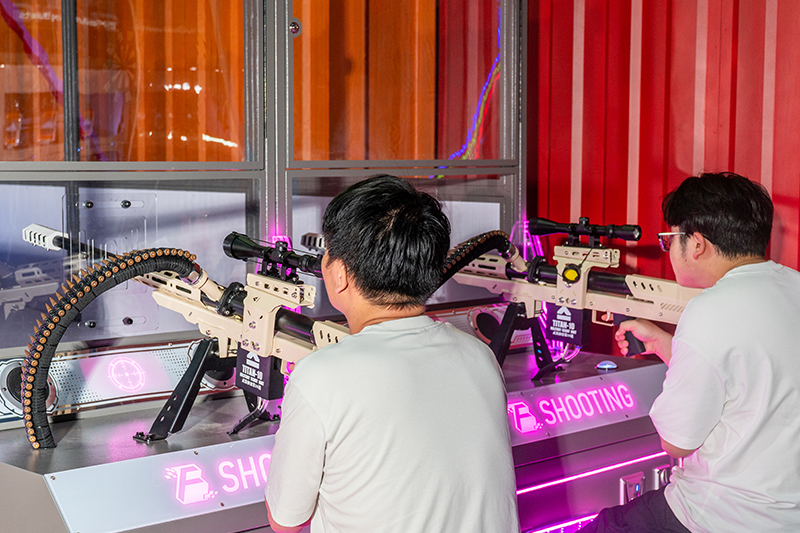Colorful Shooting is a shooting game featuring a two-layered target system with a total of 8 targets (4 per layer), driven by mechanical structures. Players use air-powered toy guns to shoot small balls at the targets, simulating real-world shooting effects. The toy guns provide ultra-realistic recoil feedback during firing. When a target is hit, it collapses; upon target refresh, it automatically resets to an upright position. The dual-layer targets are designed to move left and right in sync with the game's level progression, while color-changing indicator lights follow the targets' movement, increasing difficulty and excitement. The game consists of 8 levels: Level 1 involves fixed-point shooting, Level 2 features swinging targets, Level 3 presents random target shooting... Each level employs distinct gameplay mechanics, with difficulty escalating progressively. Players must clear previous levels to unlock and challenge subsequent stages